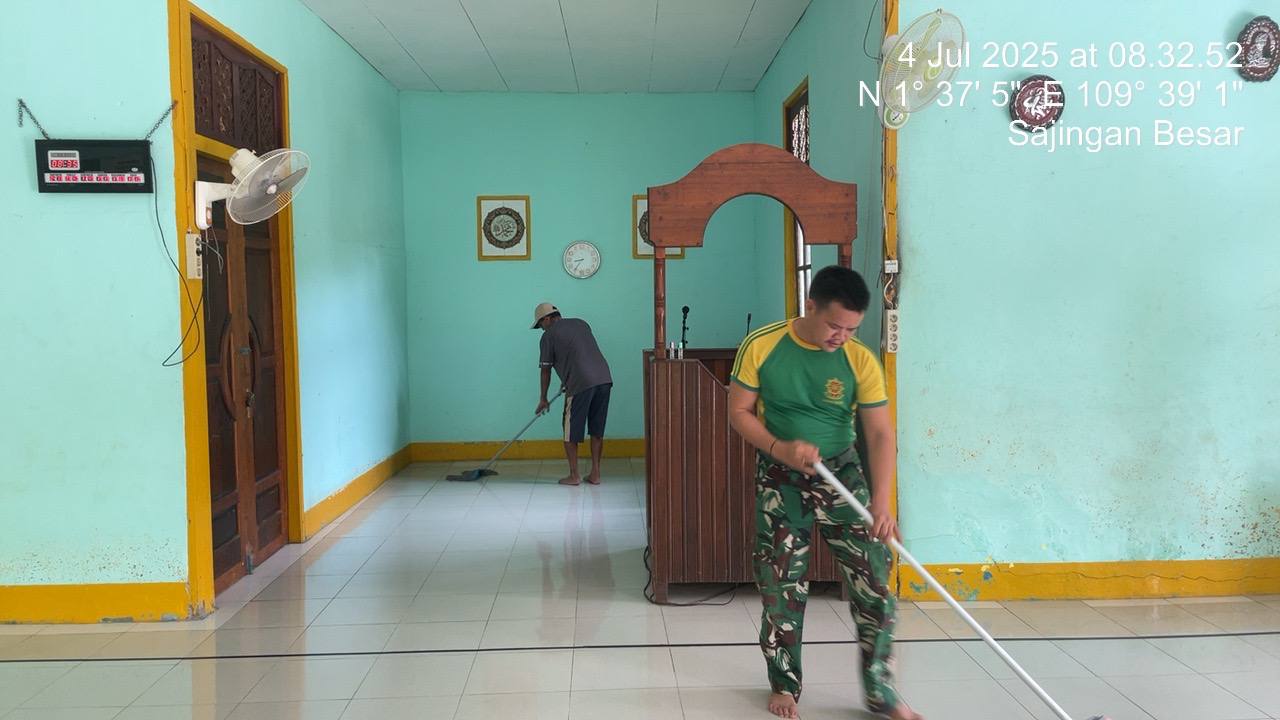 Kegiatan yang dilaksanakan pada hari Jumat (04/07/2025) ini dipimpin langsung oleh Danpos Gabma Sajingan, Letda Arh M. Irfan, bersama para prajurit pos. Sasaran utama karya bakti kali ini adalah pembersihan area dalam masjid serta pekarangan sekitar yang digunakan masyarakat untuk beribadah dan aktivitas keagamaan lainnya.